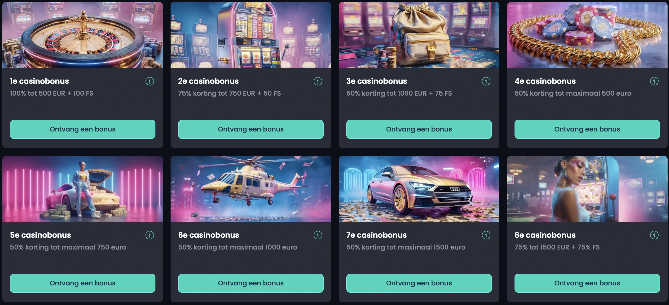Wij verwelkomen onze nieuwe spelers met een genereus bonuspakket dat bestaat uit maar liefst acht verschillende stortingsbonussen. Deze bonussen zijn speciaal ontworpen om je spelervaring te maximaliseren en je meer speeltijd te geven. Wij geloven in het belonen van loyaliteit, daarom bieden wij niet alleen een welkomstbonus, maar ook doorlopende bonussen voor je volgende stortingen. Elke bonus komt met zijn eigen voordelen, variërend van percentages tot gratis spins. Onze bonusvoorwaarden zijn transparant en eerlijk opgesteld. Wij zorgen ervoor dat je optimaal profiteert van onze promoties en het maximale uit je speelervaring haalt bij ons casino.